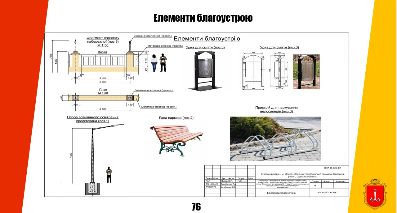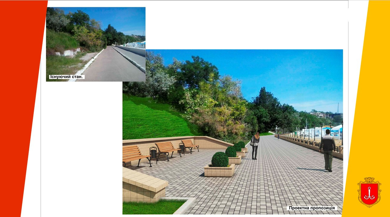 Новий проєкт передбачає уніфікацію всіх елементів інфраструктури: від покриття доріжок і вуличних меблів до освітлення, підпірних конструкцій та рішень для маломобільних груп населення. Особливу увагу приділили безбар’єрності — до вже існуючих 12 пандусів додадуть ще шість, а також модернізують наявні підйомники.