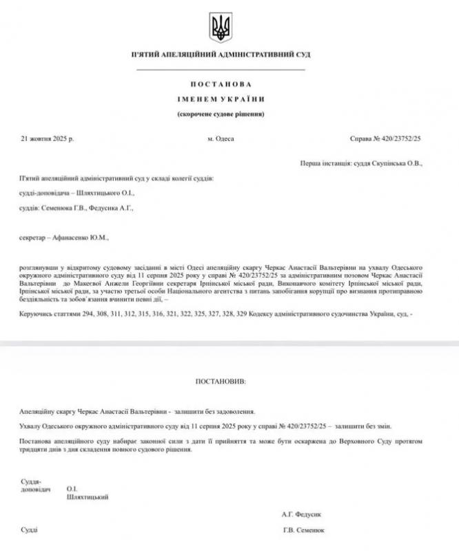 П’ятий апеляційний адміністративний суд залишив без задоволення апеляційну скаргу екскерівниці земельного відділу Ірпінської міськради Анастасії Черкас щодо незаконності дій в.о. міського голови Анжели Макеєвої. Таке рішення суд прийняв у вівторок, 21 жовтня.