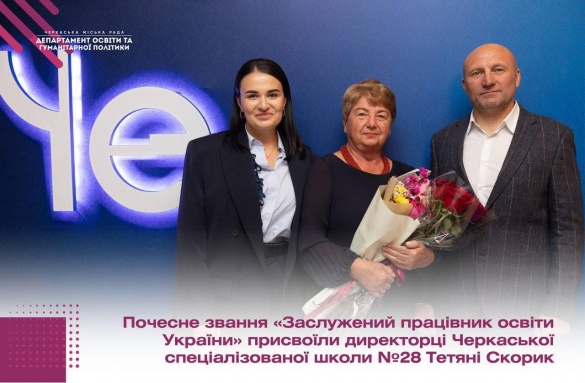 Директорка Черкаської спеціалізованої школи І-ІІІ ступенів №28 імені Т.Г. Шевченка Тетяна Андріївна Скорик отримала почесне звання "Заслужений працівник освіти України". Відповідний Указ Президента України №742/2025 було опубліковано з нагоди Дня працівників освіти.