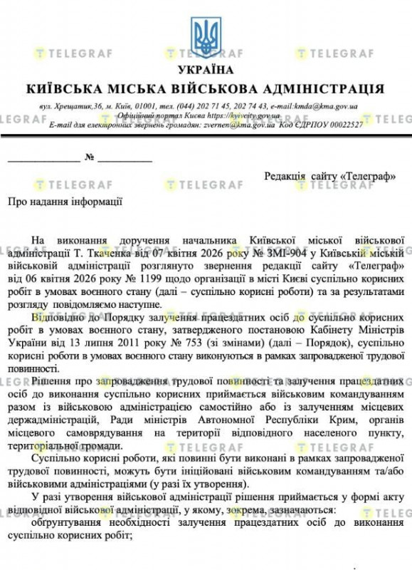 В Києві, як і в Одесі, можуть запровадити суспільно корисні роботи, які включатимуть розбір завалів після атак. Це рішення буде прийматися відповідно до закону та правових норм. Видання Телеграф отримало цю інформацію у відповідь на запит до Київської міської військової адміністрації (КМВА).