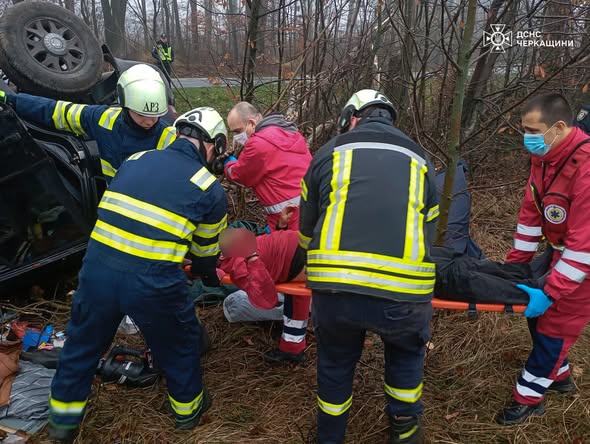 У Черкаському районі на автодорозі «Київ-Знам’янка», поблизу села Ребедайлівка внаслідок дорожньо-транспортної пригоди травмовані 2 людей. Рятувальники, окрім відключення акумуляторної батареї автомобіля, надали допомогу у транспортуванні постраждалих до автомобіля екстреної швидкої допомоги.