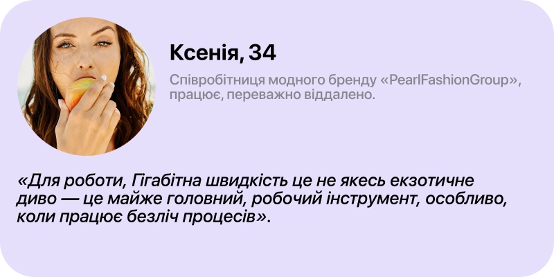 У моїй професійній діяльності високошвидкісне з’єднання відіграє вирішальну роль, оскільки значну частину робочого часу займають онлайн наради з командою та підрядниками. Постійно взаємодію з корпоративною мережею: завантажую об’ємні архіви з фотоматеріалами, швидко отримую доступ до необхідних документів.