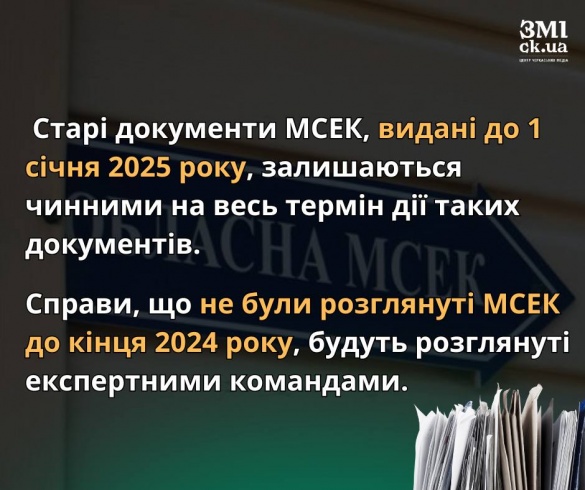 Старі документи МСЕК, видані до 1 січня 2025 року, залишаються чинними на весь термін дії таких документів. Справи, що не були розглянуті МСЕК до кінця 2024 року, будуть розглянуті експертними командами. При цьому людині повідомлять про дату та нову адресу, де відбудеться оцінювання. Тим, у кого інвалідність встановлена пожиттєво, оцінювання проходити не потрібно. Зберігають чинність всі права, документи, виплати, пільги, соціальні послуги та відстрочки.