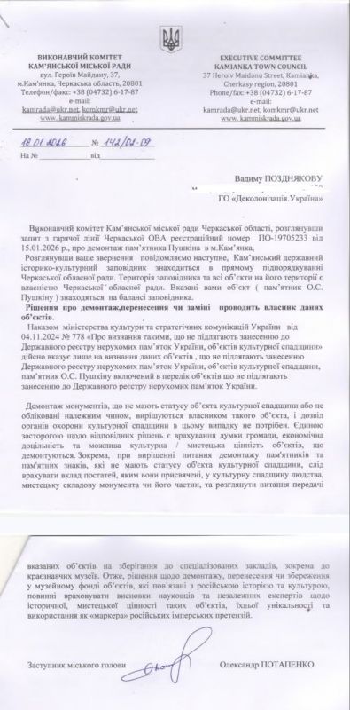 У відповіді на звернення активістів представники міської влади зазначили, що пам’ятник нібито перебуває на балансі Черкаської обласної ради, та порадили адресувати вимоги щодо його демонтажу саме обласному органу влади.