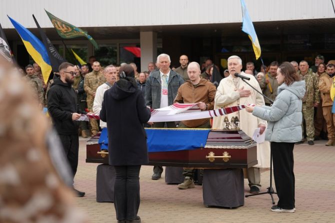 “Шановна громадо, побратими, небайдужі громадяни, сьогодні ми прощаємося не просто з людиною, ми проводжаємо в останню дорогу героя, мужнього захисника України, борця за справедливість і право українського народу жити в вільній, незалежній Україні”, — прокоментував син загиблого ветерана Олександр Русінов.