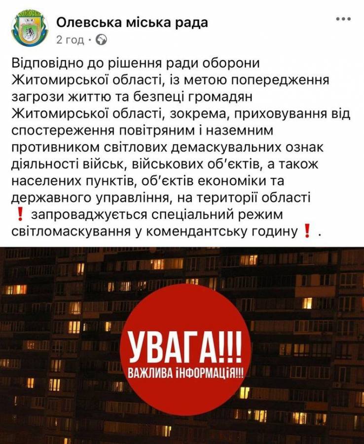 Олевська міська рада про світломаскування. Скриншот зі сторінки Олевської міської ради у Facebook