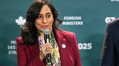 Міністерка закордонних справ Канади Аніта Ананд робить кілька заяв перед тим, як позувати для спільного фото під час зустрічі міністрів закордонних справ G7 у курортному готелі White Oaks, Онтаріо, Канада, 11 листопада 2025 року. AP/Mandel Ngan