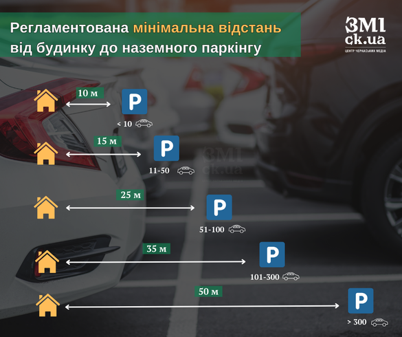 Паркінг має бути не далі, ніж за 700 метрів від квартири власника. А мінімальна відстань від будинку до гостьової автостоянки складає 150 м.