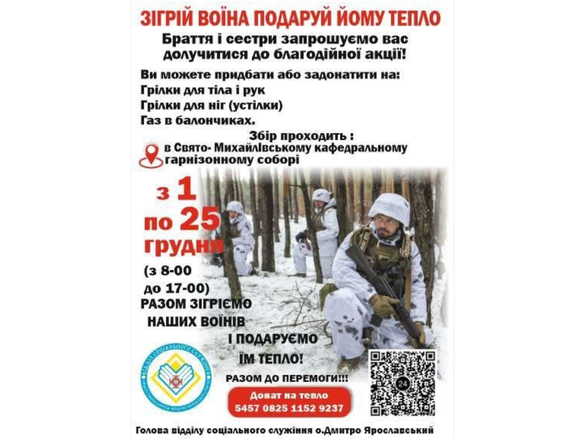 Захисникам у зимовий період особливо потрібні теплі речі та засоби, які допоможуть їм зберегти здоров’я й витримати складні погодні умови. До збору можуть долучитися всі охочі.