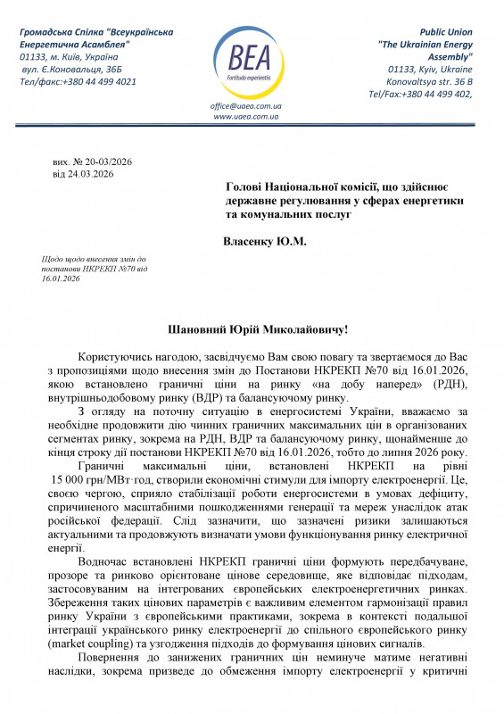 Він звернувся до НКРЕКП із пропозицією внести зміни до постанови №70 та продовжити дію чинних граничних цін на ринку «на добу наперед», внутрішньодобовому та балансуючому сегментах.