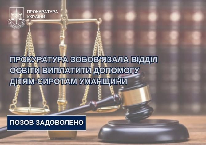 Уманська окружна прокуратура через суд зобов’язала відділ освіти однієї з громад Уманського району виплатити одноразову грошову допомогу випускникам шкіл, які мають статус дітей-сиріт або дітей, позбавлених батьківського піклування.