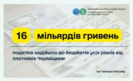 Як повідомляє в.о. начальника Головного управління ДПС у Черкаській області Володимир Жаврід, за січень-липень 2024 року платниками Черкаської області до бюджетів усіх рівнів сплачено 16 281 млн грн податків, зборів та платежів. У порівнянні з показником січня-липня 2023 року до бюджетів спрямовано на 24%, або на 3 150 млн грн податків більше.