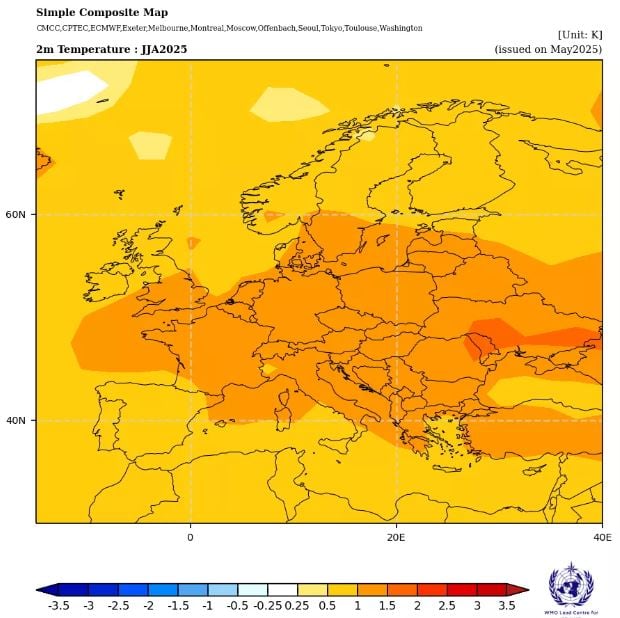 Карта распределения аномалии средней летней температуры в Европе (июнь, июль, август) по данным расчетов 11 мировых центров прогноза погоды: