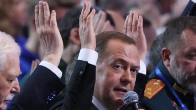Дмитро Медведєв (у центрі) голосує під час пленарного засідання 22-го з’їзду партії “Единая Россия”, Москва, Росія, 14 грудня 2024 року. Getty Images/Contributor