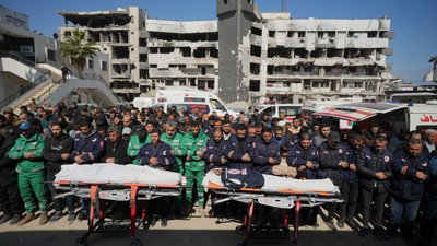 Парамедики та родичі моляться біля тіл Мохаммеда Абу Шаука та Абдула Рахмана Хамдуни, які загинули вчора внаслідок обстрілу їхнього автомобіля, під час його похорону в лікарні Шифа в місті Газа в понеділок, 9 березня 2026 року. AP/Jehad Alshrafi