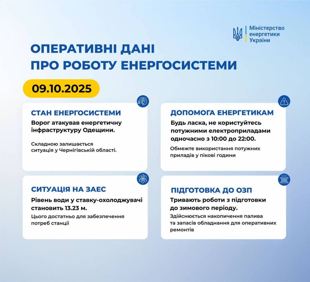 По данным Минэнерго, российские войска 9 октября нанесли массированные удары по энергетической инфраструктуре Одесской области, однако сложная ситуация сохраняется именно в Черниговской области. Энергетики продолжают восстанавливать электроснабжение и предпринимают меры для стабилизации работы системы.