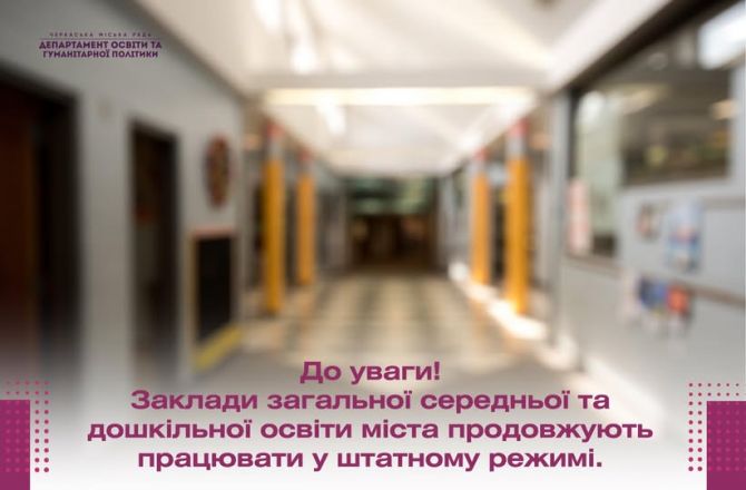Заклади загальної середньої та дошкільної освіти міста продовжують працювати у штатному режимі.