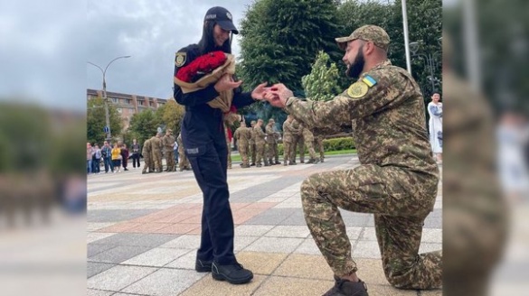 Під час урочистих заходів на честь Дня Державного Прапора України сьогодні, 23 серпня, один із бійців Нацгвардії звернувся до коханої з освідченням, яке відбулося прямо на святковому заході.