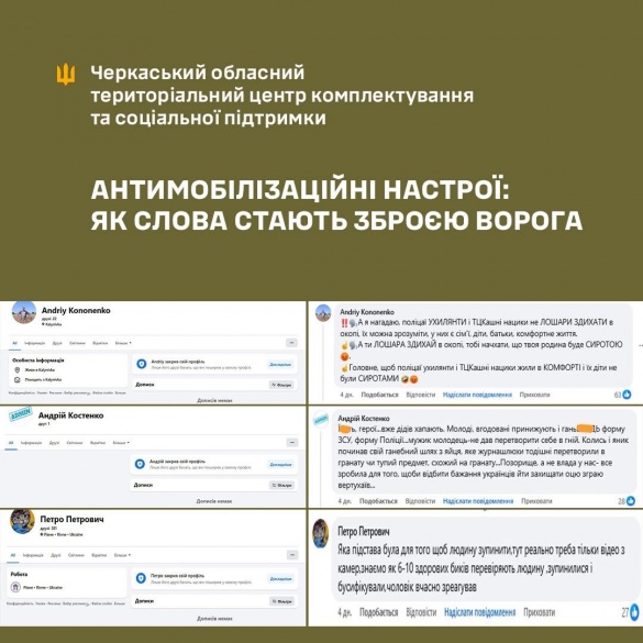 Аналіз коментарів до публікацій Черкаського об’єднаного територіального центру комплектування та соціальної підтримки (ОТЦК та СП) показав, що деякі профілі системно поширюють емоційно забарвлені повідомлення, неперевірені відео та маніпулятивні інтерпретації подій. Це створює враження масової критики мобілізаційних заходів та може бути частиною ширших інформаційних кампаній, спрямованих на деморалізацію суспільства.