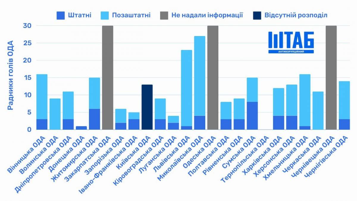 «Антикорупційний штаб» вирішив дізнатися, скільки радників має кожен з голів ОДА та на яких умова – у штаті чи на громадських засадах вони працюють. Станом на лютий 2024 року маємо наступні дані: