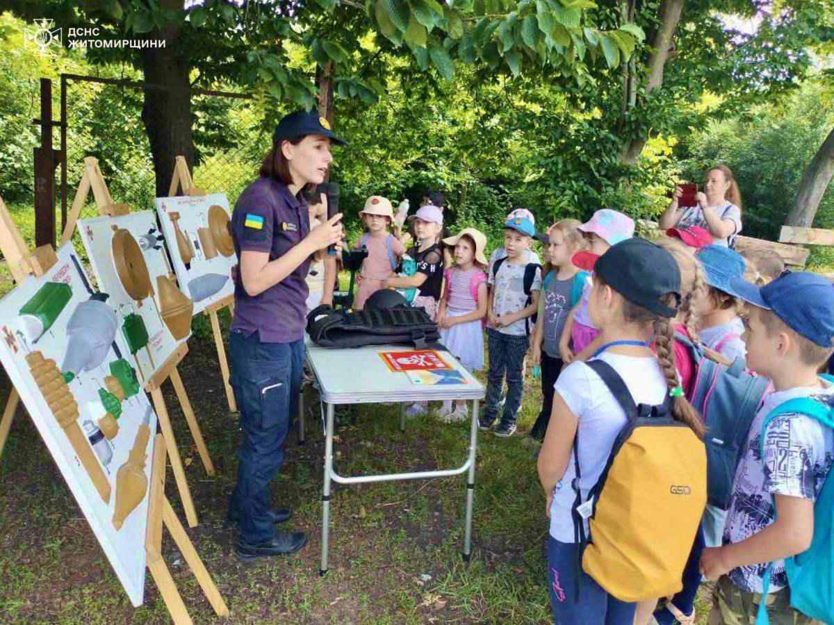 З цією метою сьогодні рятувальники завітали до вихованців пришкільного табору, що створений на базі ліцею № 10 в м. Житомир. Спільно із дітьми вони обговорили як безпечно поводити себе при виявленні невідомих та підозрілих предметів. За допомогою 3D макетів діти ознайомилися із зразками вибухонебезпечних предметів, приміряли бронежилет і каску піротехніків ДСНС, а також пошукали умовні боєприпаси справжнім міношукачем. Учасники табору мали можливість оглянути пожежно-рятувальну техніку та збити струменем води з підставки м’яч.