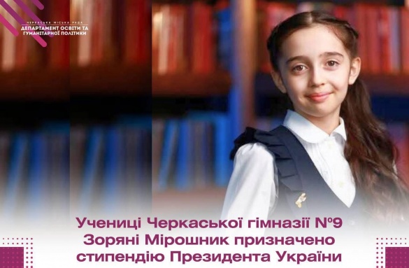 Шестикласниця Черкаської гімназії №9 імені О.М. Луценка Зоряна Мірошник стала стипендіаткою Президента України.