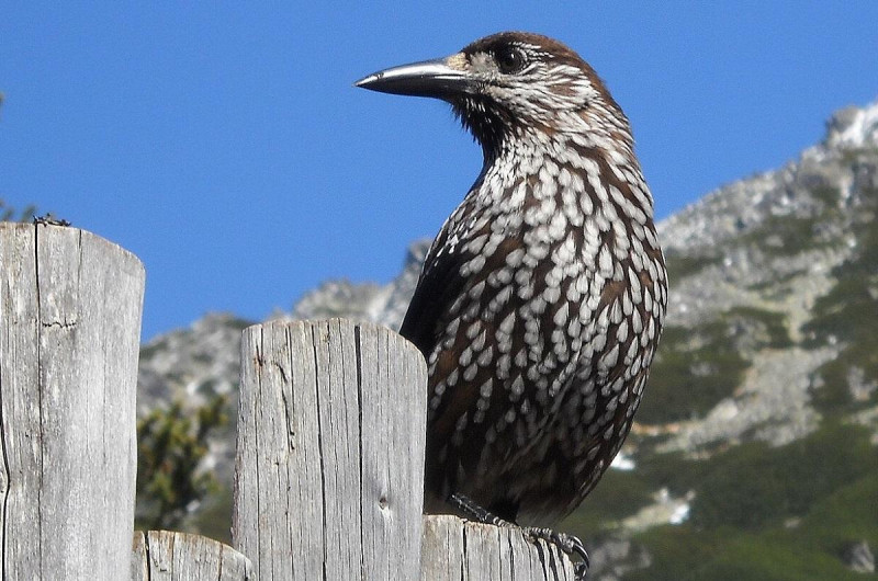Довідка УНІАН. Горіхівка крапчаста або кедрівка – птах з роду горіхівок родини воронових. Має 10 підвидів. Забарвлена у темний коричнево-бурий колір з білими плямами. На кінці хвоста світла облямівка.