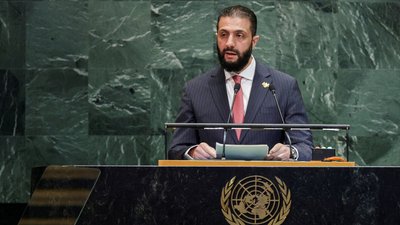 Тимчасовий президент Сирії Ахмед аш-Шараа виступає на 80-й Генасамблеї ООН у штаб-квартирі організації у Нью-Йорку, США, 24 вересня 2025 року. REUTERS/Jeenah Moon