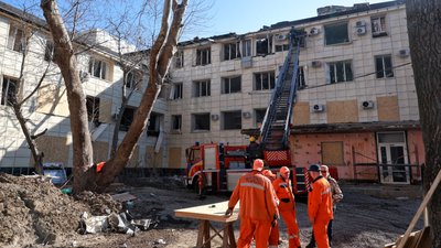 Комунальні працівники герметизують вікна пологового будинку № 5, пошкодженого внаслідок удару дрона в Одесі, Україна, 28 березня 2026 року. Getty Images/Nina Liashonok/Ukrinform