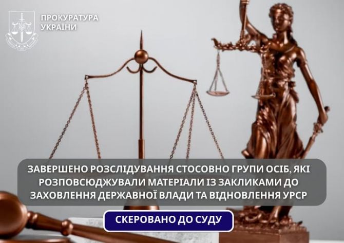 Прокурорами Черкаської обласної прокуратури скеровано до суду обвинувальний акт стосовно 5 осіб, які розповсюджували матеріали із закликами до захоплення державної влади та відновлення УРСР (ч. 2 ст. 28, ч.ч. 2, 3 ст.109, ч. ч. 1, 2¸ 3 ст. 436-2 КК України).